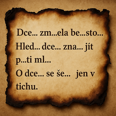 Zůstal z něj jen torzovitý text — tři věty s vytrhanými kusy, jako by někdo schválně nechal jen to nejnutnější.